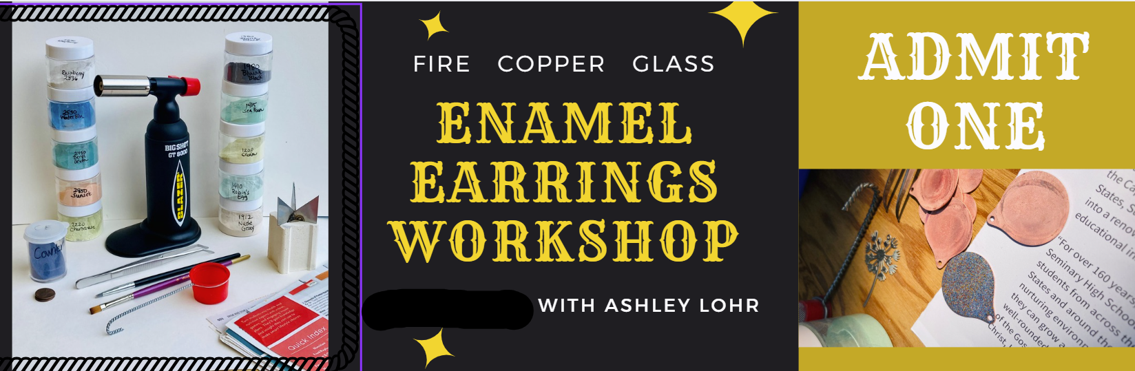 Come create a beautiful, enameled pair of earrings with Petersburg artist: Ashley Lohr. In this workshop, participants will learn how to create one-of-a-kind enamel pieces using Thompson powder enamel sifted onto copper blanks. We will discuss enamel consistency, application, prepping, cleaning, stenciling, ombre and sgraffito techniques. This ancient craft of enameling allows for the unique addition of glass color to metal designs by adding heat between 1300* F to 1500*F.